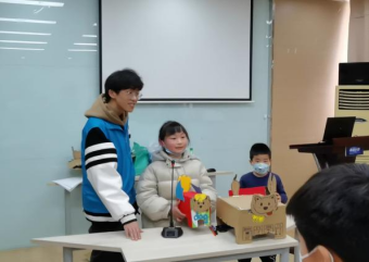 科普课程结束后,“红细胞”志愿服务队成员带领小朋友们利用废旧纸箱,一起制作属于自己的纸箱小动物。小朋友们发挥自己的想象力和创造力,纷纷动手在纸箱上裁剪作画,并用彩色卡纸进行装饰。完成后,小朋友在志愿者的引导下一一走上讲台,勇敢地向大家展示并讲解自己DIY的可爱小动物。在此次活动中,小朋友们真切体会到了“变废为宝”的乐趣,还培养了小朋友们的想象力、动手能力以及表达能力。